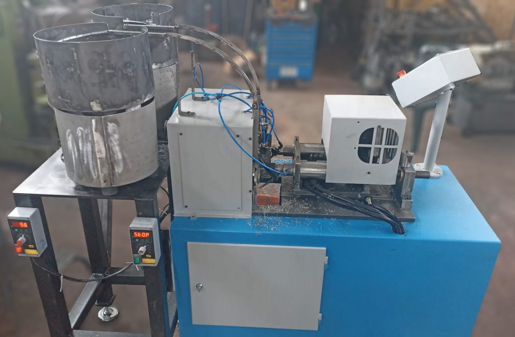 Alüminyum mandalların deliklerini delmek için geliştirilmiş, vibrasyon beslemeli, tek taraflı matkaba sahip, tam otomatik seri üretim makinesidir.