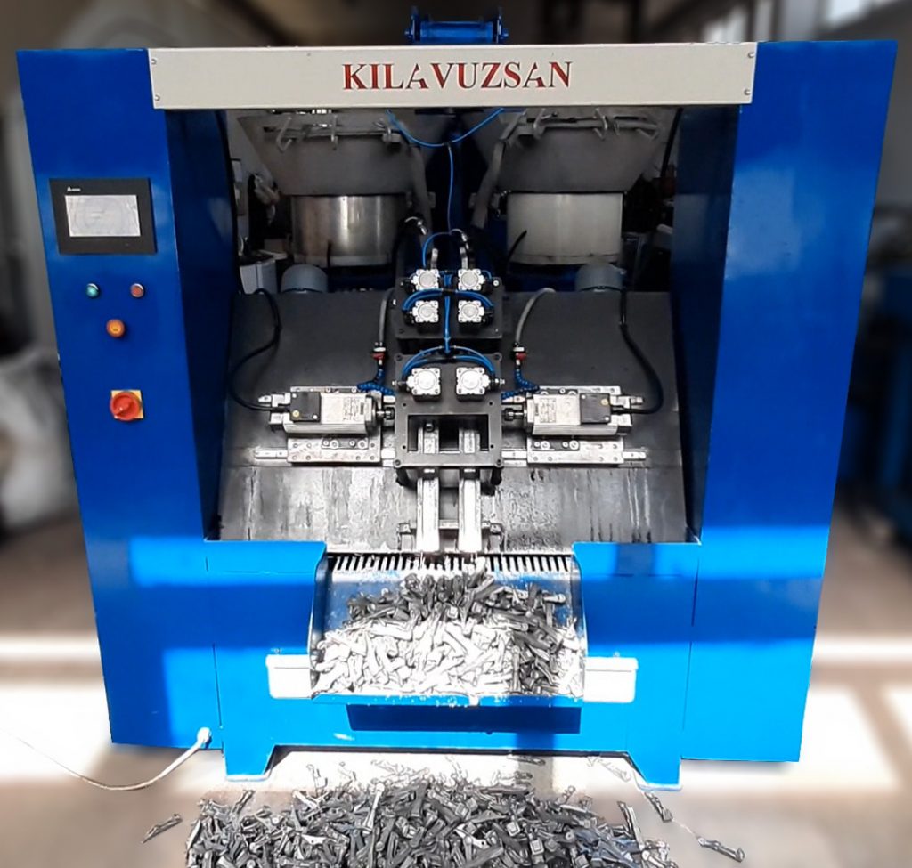 Alüminyum mandalların deliklerini delmek için geliştirilmiş, vibrasyon beslemeli, çift taraflı matkaba sahip, tam otomatik seri üretim makinesidir.